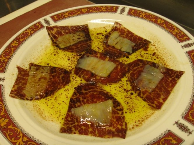 La preparación es así de sencilla: en un plato se colocan las lonchas de cecina cortadas en un tamaño medio para un bocado. A continuación, se corta el bacalao en lonchitas finas para cubrir las de cecina.